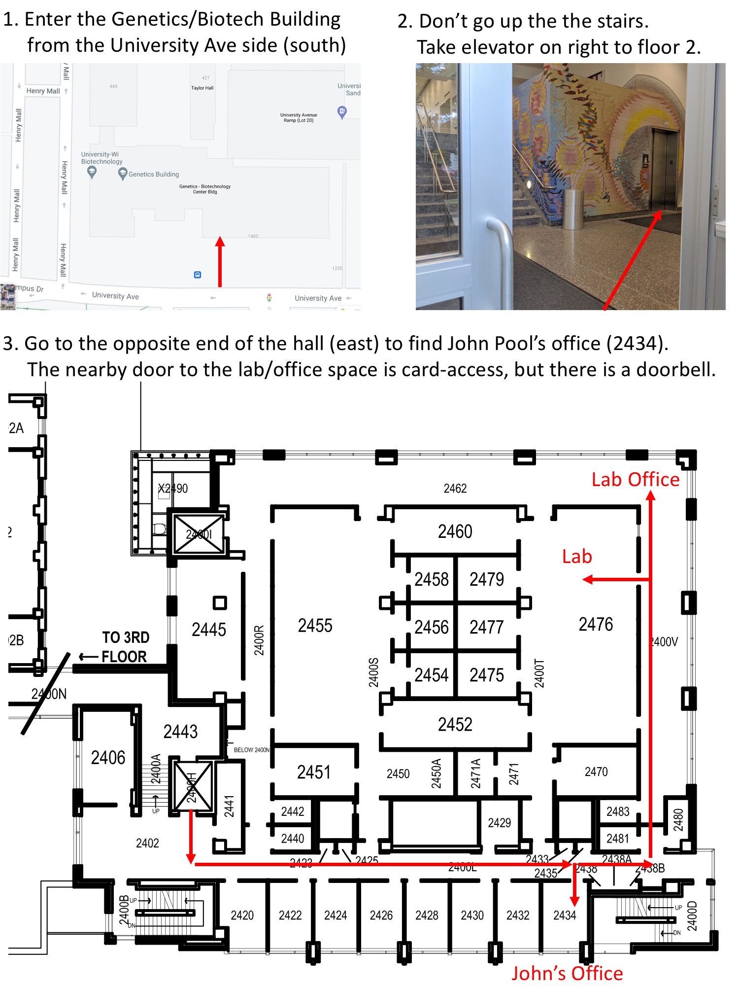 | Contact information: John e-mail: jpool at wisc dot edu Lab phone: (608)263-6804 Mailing address: John Pool University of Wisconsin-Madison 425G Henry Mall (Genetics/Biotech Bldg) Madison, WI 53706 How to find us: Genetics/Biotech Building, room numbers: John's office: 2434 Lab office: 2462 (ring doorbell at far end of hall) ![]() |