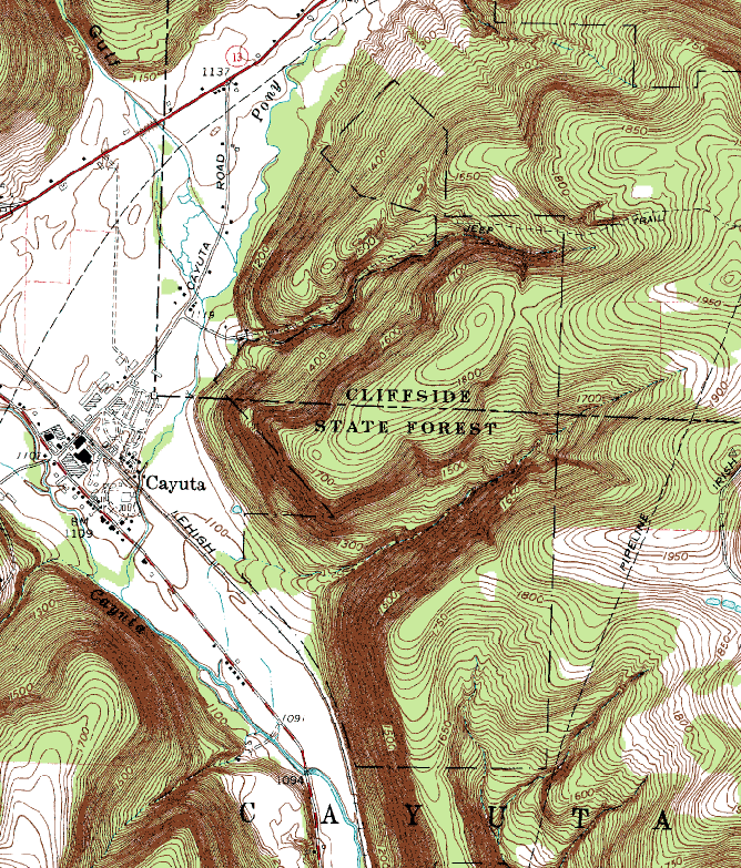 Cliffside wins the prize as the least accessible public land in Tompkins County. There are no roads to the north. To the west, Morrell Road dead-ends short of the forest boundary (with a thicket of orange "posted signs" between the public road and the public land). A narrow strip of private land separates the state forest from NY Route 224 to the south. To the east of Cliffside is Arnot Forest, which is owned by Cornell. But you can't make the relatively direct approach via Irish Hill Road, because Cornell has closed this road indefinitely at the gate to Arnot. Instead, you have to take (Schuyler) County Route 13 (Jackson Hollow Road), which is accessible from Van Kirk Road in the north or NY Route 224 in the south. From here, a turn onto Banfield Road allows you to enter Arnot. Driving on, you eventually reach the northwestern section of this forest, where the road makes a sharp turn from northward to eastward. Here a jeep trail continues west, while the pipeline cuts through from NNE to SSW. Park at the junction and hike west for 2/3 of a mile. Along the way, you'll need to fork left where the old jeep trail veers away from a newer logging road. This isn't the first possible left - it's at a clearing where both possible forks are about equally distinct. If you can manage that, you'll soon find yourself in Cliffside State Forest (congratulations). From here, the jeep trail drops down through a section of this forest. Other trails veer off and soon hit private land, and the jeep trail itself leaves the state forest before too long. If I make it out here again, I'll try for the cliffs visible on the topo map below (this time I had forgotten the map and ran out of water on a hot day).